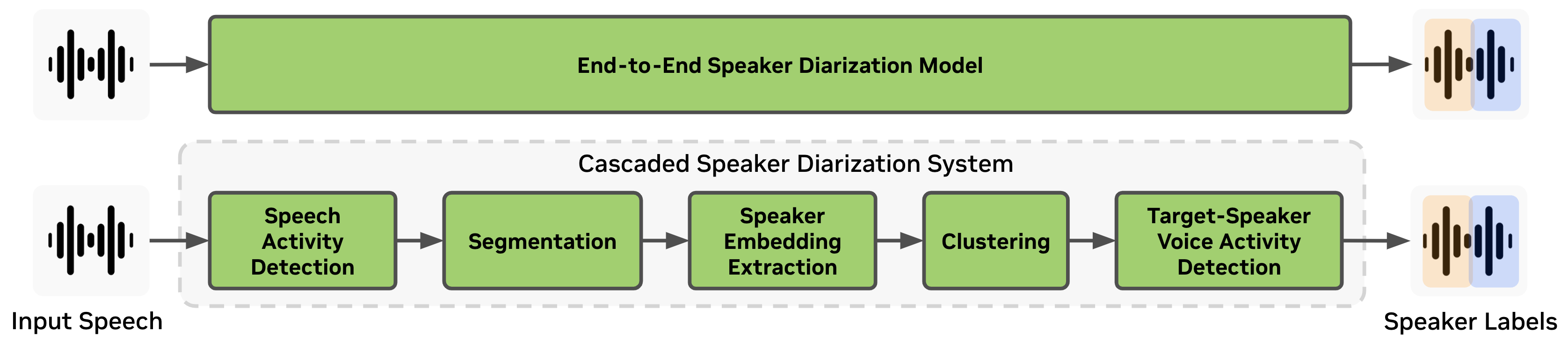 Traditional cascaded (also referred to as modular or pipelined) speaker diarization systems consist of multiple modules such as a speaker activity detection (SAD) module and a speaker embedding extractor module. On top of the clustering diarizer, target-speaker voice activity detection (VAD) is performed to generate the final speaker labels. Cascaded speaker diarization systems are more challenging to optimize all together and deploy but still has advantage of having less restriction on the number of speakers and session length.