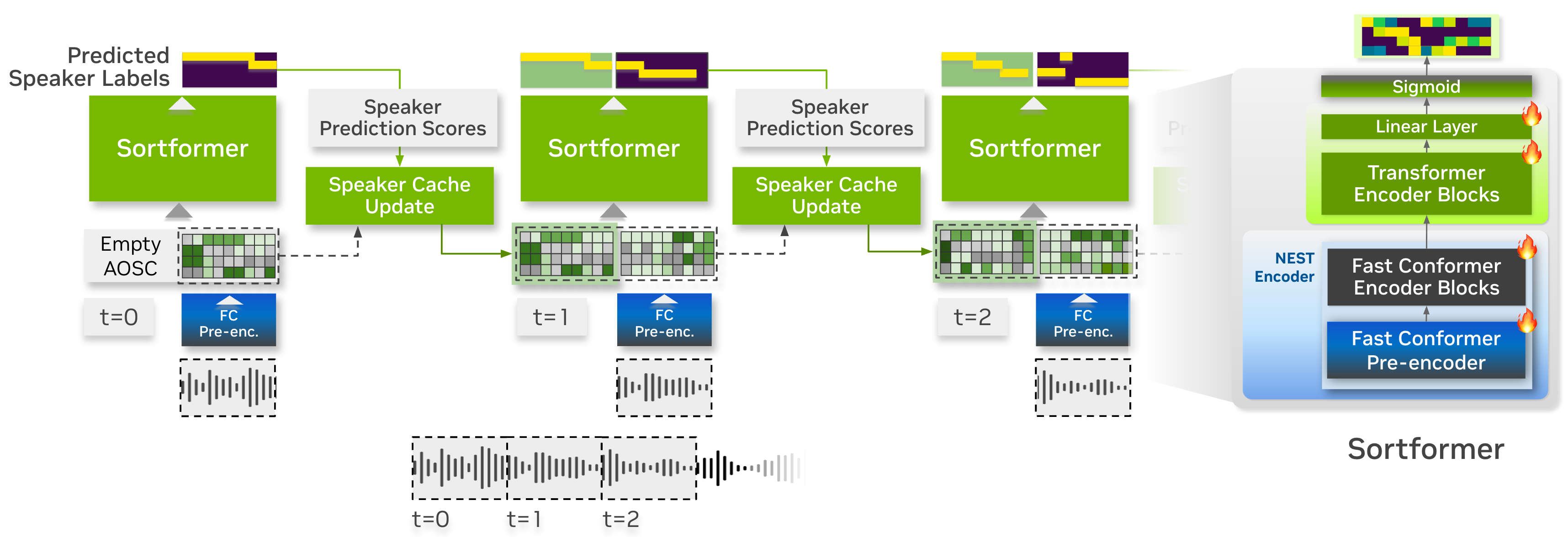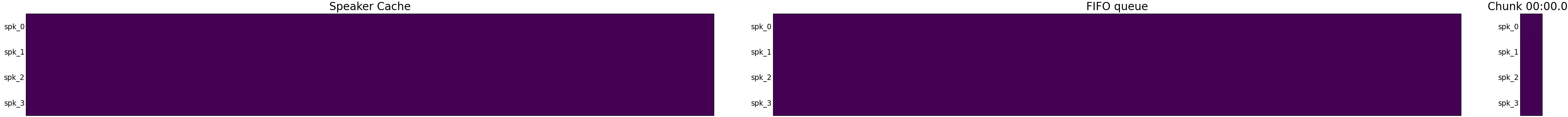 Below is the animated heatmap illustrating real-time speaker diarization for a three-speaker conversation using Streaming Sortformer. The heatmap shows how activities of speakers are detected in the current chunk and updated in the Arrival-Order Speaker Cache and FIFO queue.