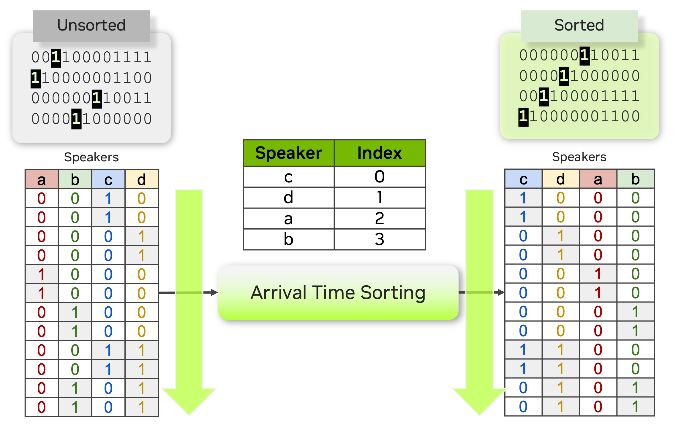 Sort Loss is designed to compare the predicted outputs with the true labels, typically sorted in arrival-time order or another relevant metric. The key distinction that Sortformer introduces compared to previous end-to-end diarization systems such as EEND-SA, EEND-EDA lies in the organization of class presence \(\mathbf{\hat{Y}}\).