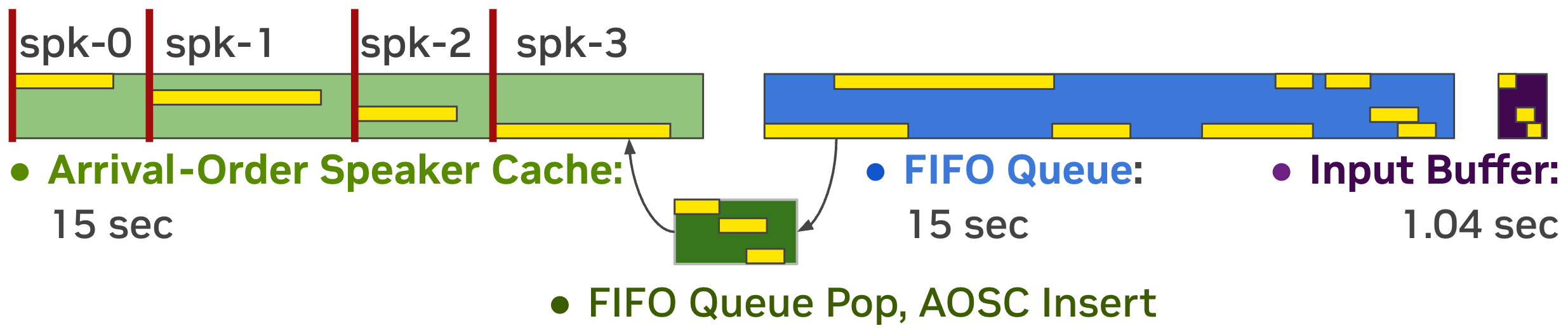 Streaming Sortformer is a streaming version of Sortformer diarizer. To handle live audio, Streaming Sortformer processes the sound in small, overlapping chunks. It employs an Arrival-Order Speaker Cache (AOSC) that stores frame-level acoustic embeddings for all speakers previously detected in the audio stream. This allows the model to compare speakers in the current chunk with those in the previous ones, ensuring a person is consistently identified with the same label throughout the stream.