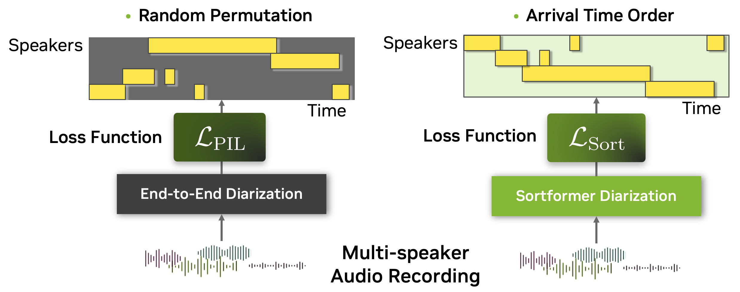 • Sort Loss simply compares the arrival-time-sorted version of speaker activity outputs for both the prediction and the target. Note that sometimes the same ground-truth labels lead to different target matrices for Sort Loss and PIL.