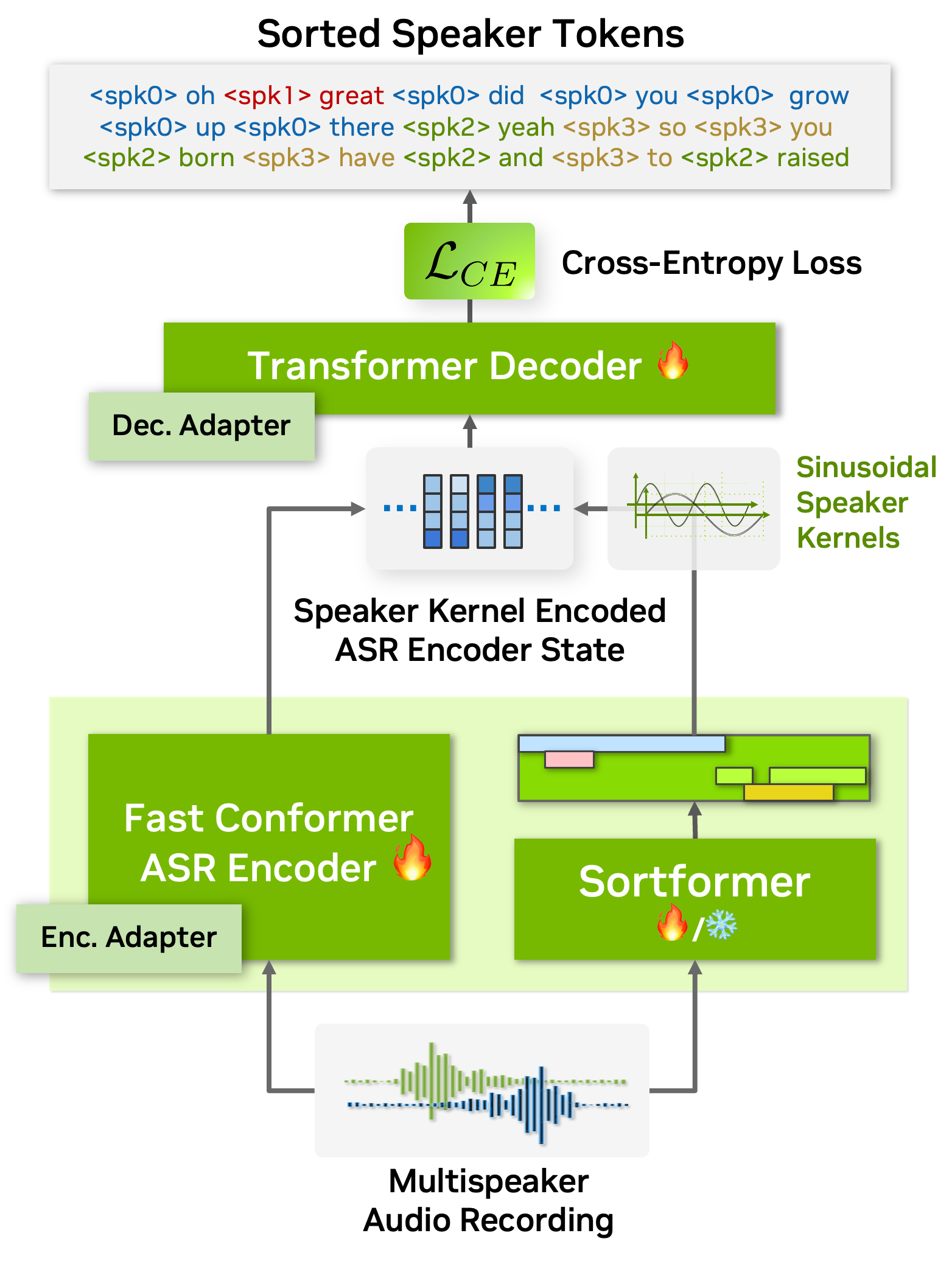 Additionally, as shown in the above figure, our diarization system integrates directly with the ASR encoder. By embedding speaker supervision data as speaker kernels into the ASR encoder states, the system seamlessly combines speaker and transcription information. This unified approach improves performance and simplifies the overall architecture.