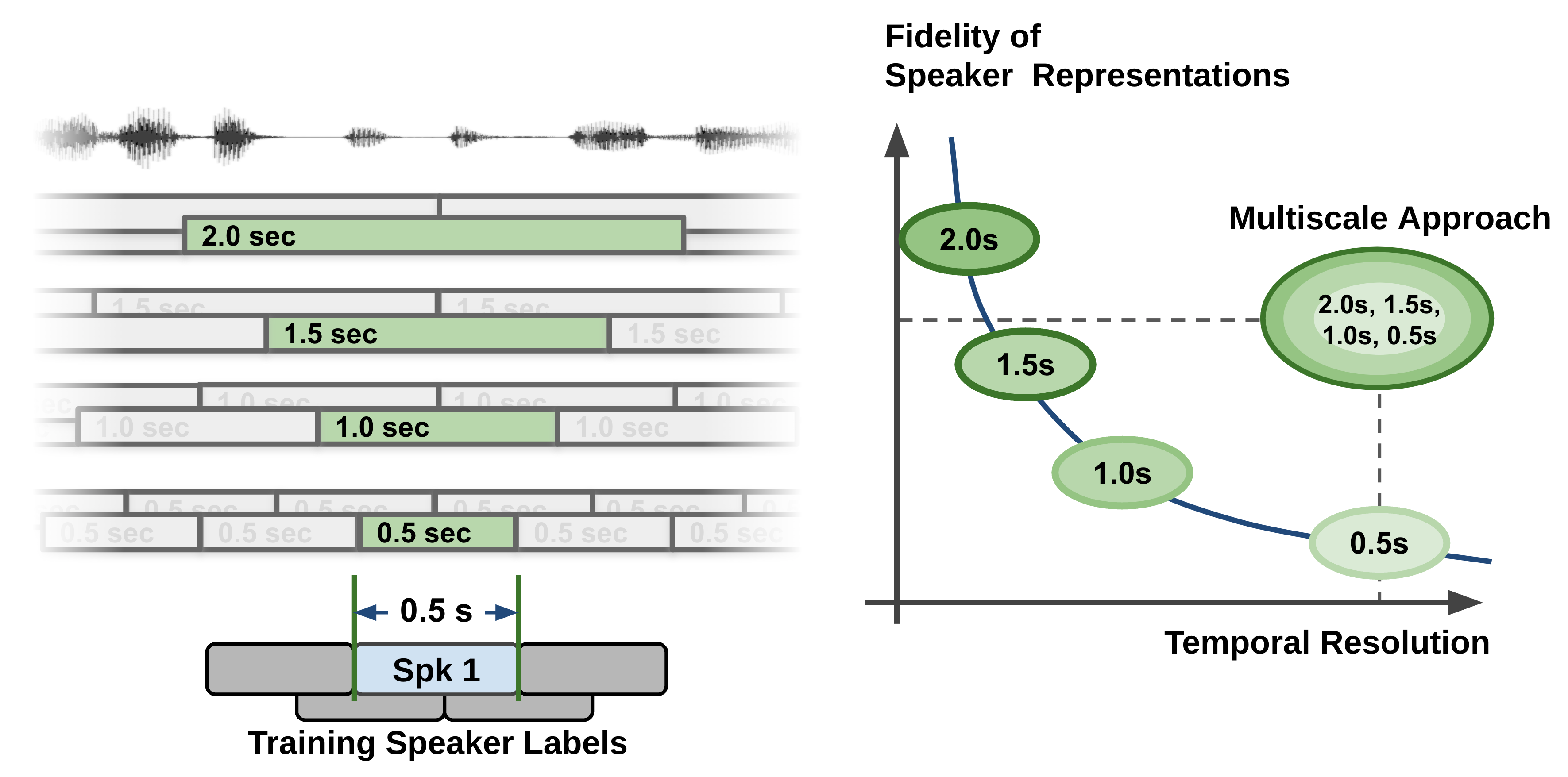 Extracting long audio segments is desirable in terms of the quality of speaker characteristics. However, the length of audio segments also limits the granularity, which leads to a coarse unit length for speaker label decisions. Therefore, speaker diarization systems are challenged by a trade-off between temporal resolution and the fidelity of the speaker representation, as depicted in the curve shown in the figure below. During the speaker feature extraction process in the speaker diarization pipeline, the temporal resolution is inevitably sacrificed by taking a long speech segment to obtain high-quality speaker representation vectors. In plain and simple language, if we try to be very accurate on voice characteristics then we need to look into a longer span of time. However, at the same time, if we look into a longer span of time, we have to make a decision on a fairly long span of time and this leads to coarse decisions (temporal resolution is low). This can be easily understood if we think about the fact that even human listeners cannot accurately tell who is speaking if only half a second of recorded speech is given.