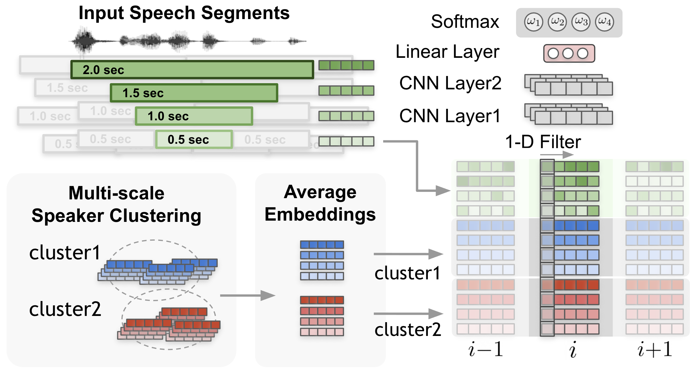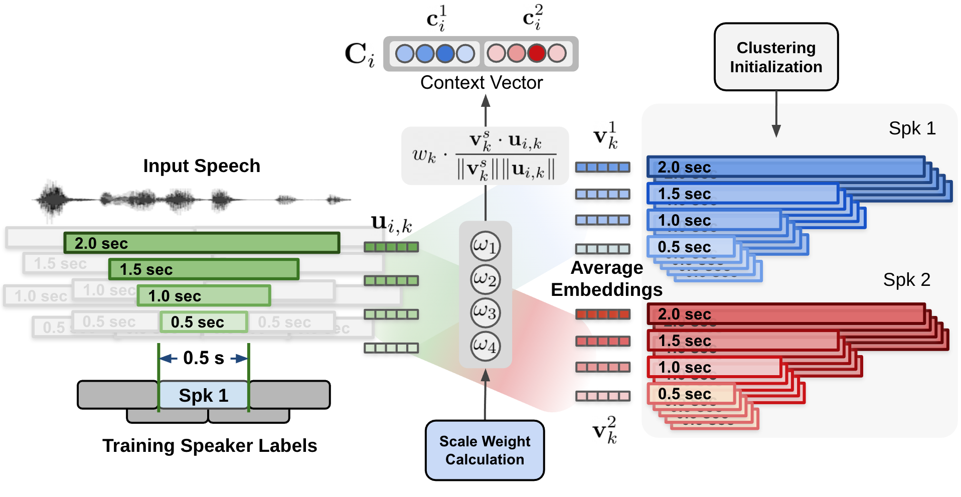 Most importantly, the weight of each scale at each time step is determined through a scale weighting mechanism where the scale weights are calculated from a 1-D convolutional neural networks (CNNs) applied to the multi-scale speaker embedding inputs and the cluster average embeddings as described in the above figure.
