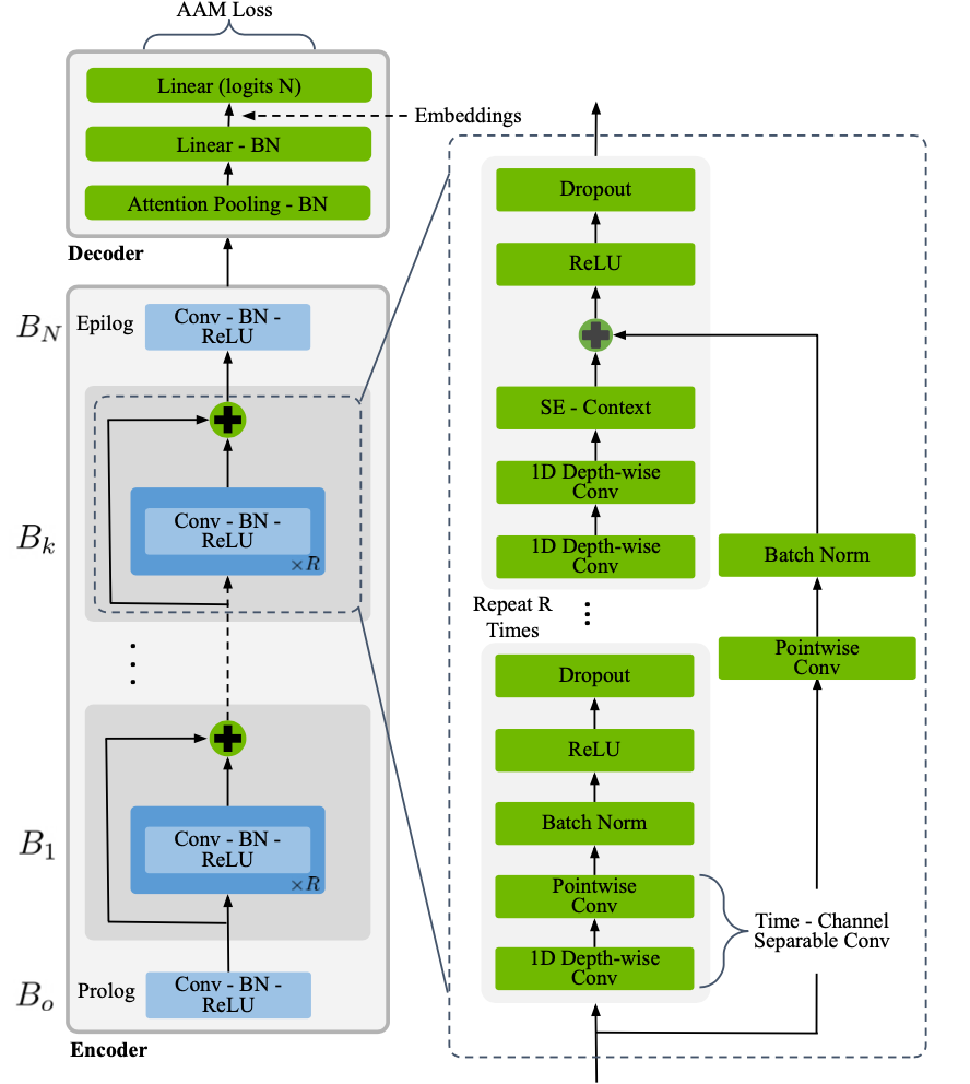 The QuartzNet encoder used for speaker embeddings shown in figure below has the following structure: a QuartzNet BxR model has B blocks, each with R sub-blocks. Each sub-block applies the following operations: a 1D convolution, batch norm, ReLU, and dropout. All sub-blocks in a block have the same number of output channels. These blocks are connected with residual connections. We use QuartzNet with 3 blocks, 2 sub-blocks, and 512 channels, as the Encoder for Speaker Embeddings. All conv layers have stride 1 and dilation 1.